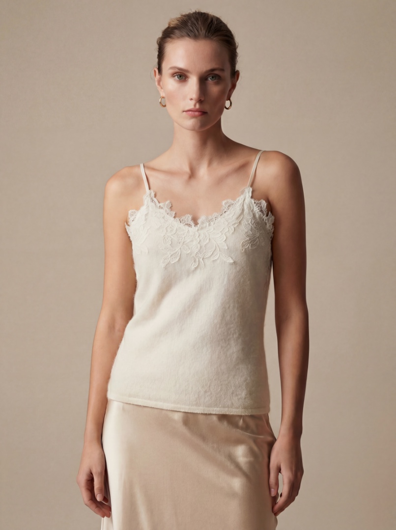 Нежный топ из кашемира на бретельках расшит по груди нежным кружевом