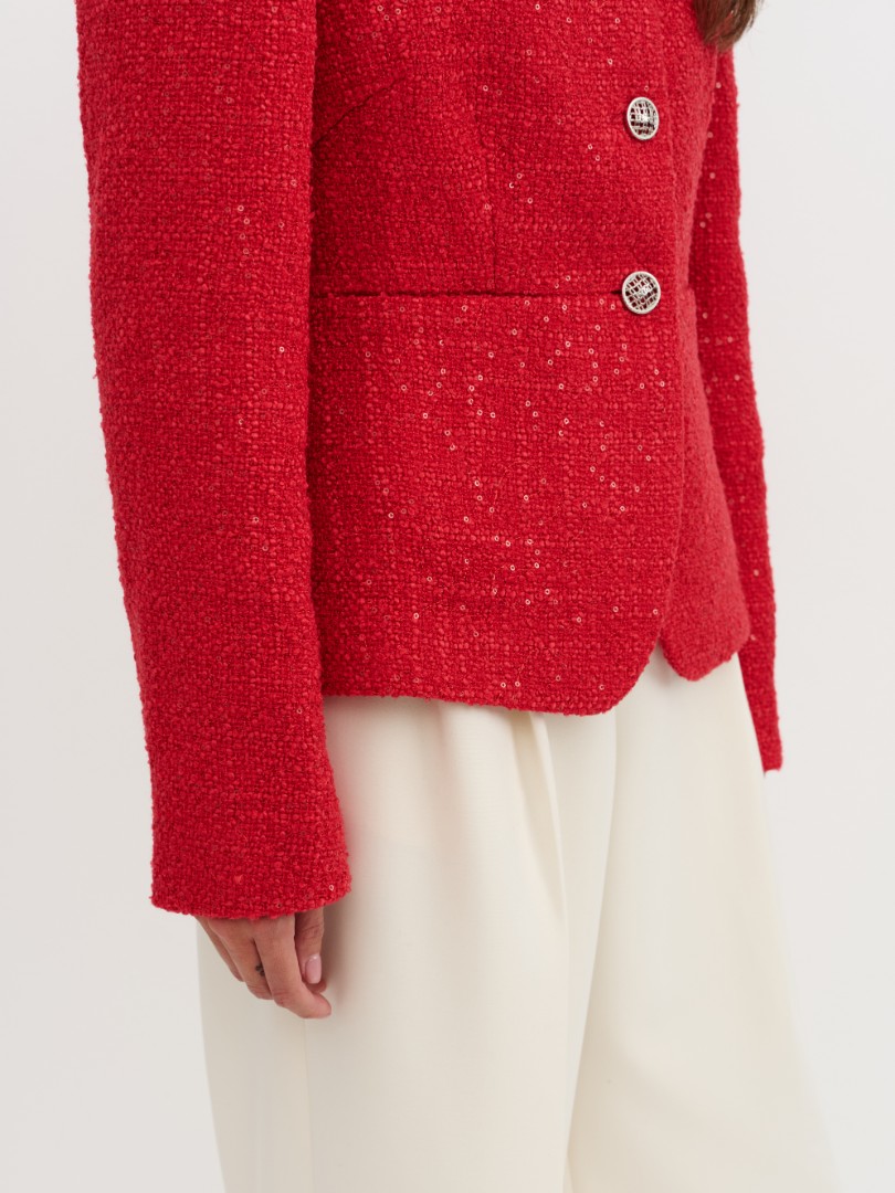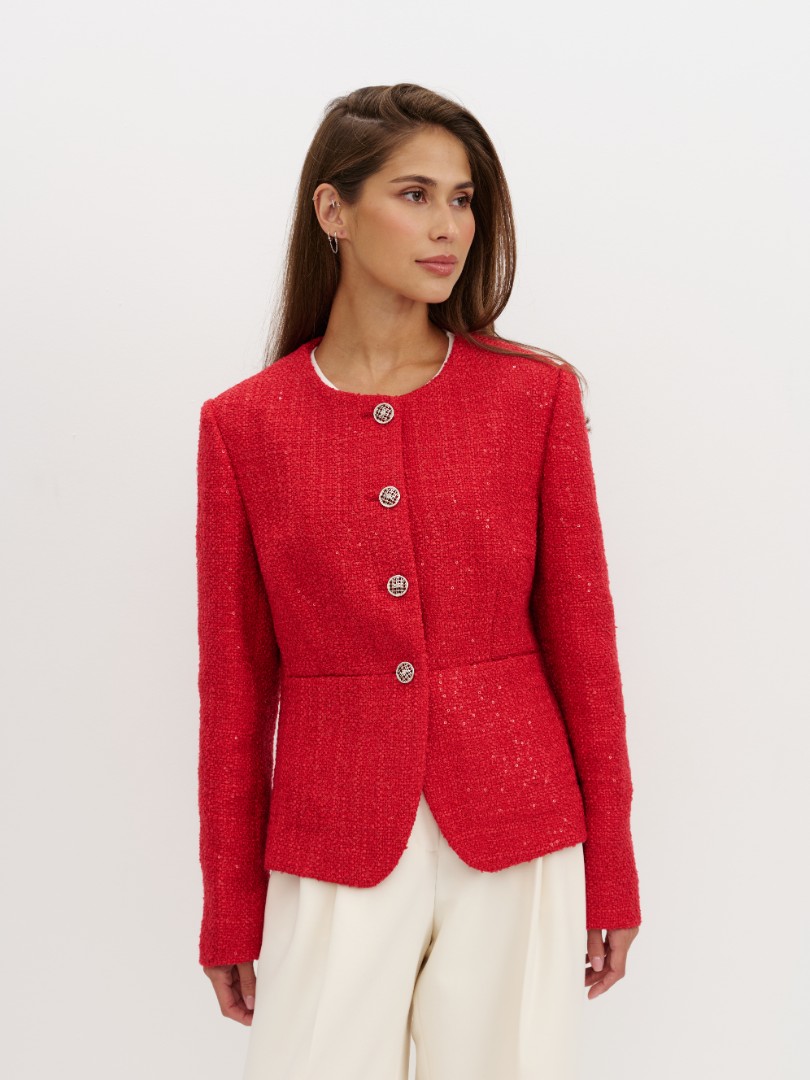 Приталенный жакет с карманами выполнен из тончайшего расшитого нитками твида с шелковой подкладкой