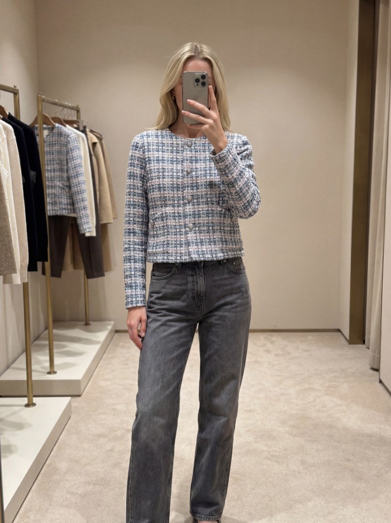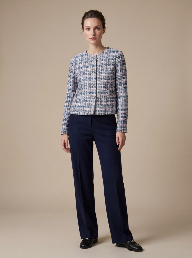 Жакет из тонкого изысканного твида крупного плетения, оттенки от нежно-розового до глубокого синего. Аккуратные карманы обработаны тоненькой декоративной цепочкой