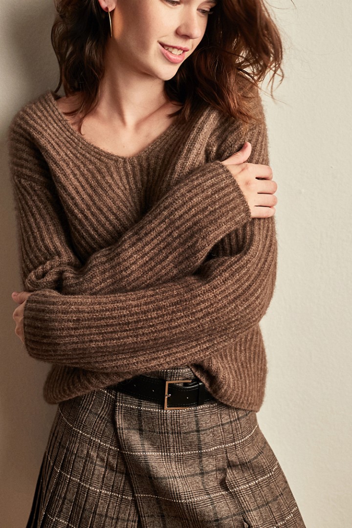 Кашемировый джемпер с V-образным вырезом, крупной вязки