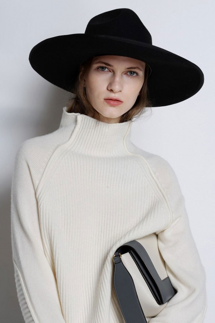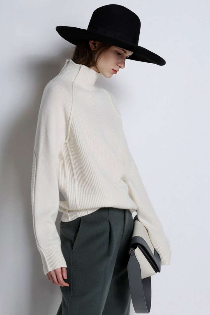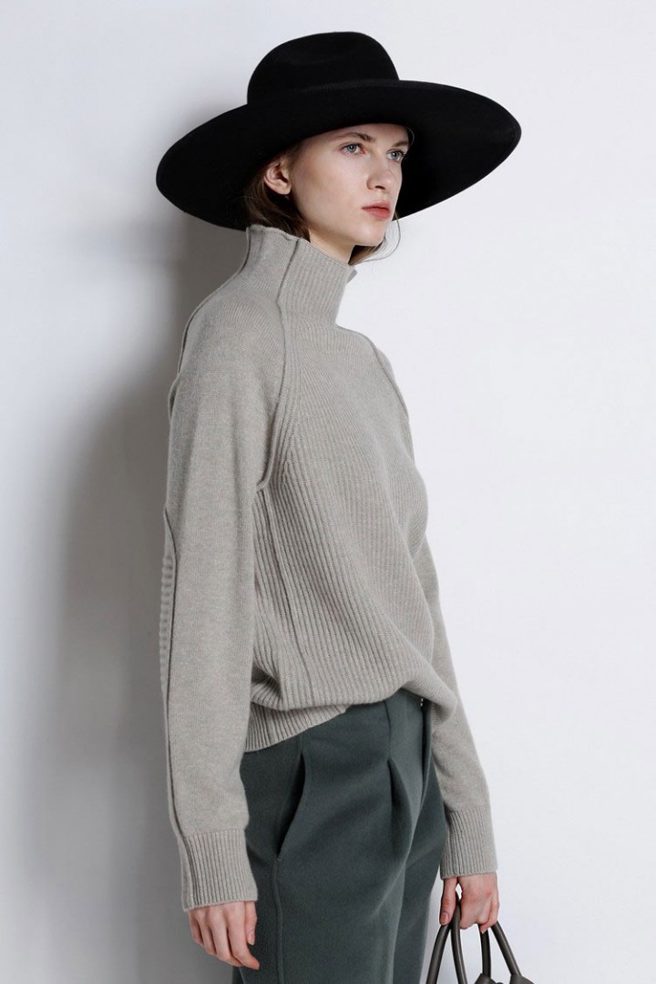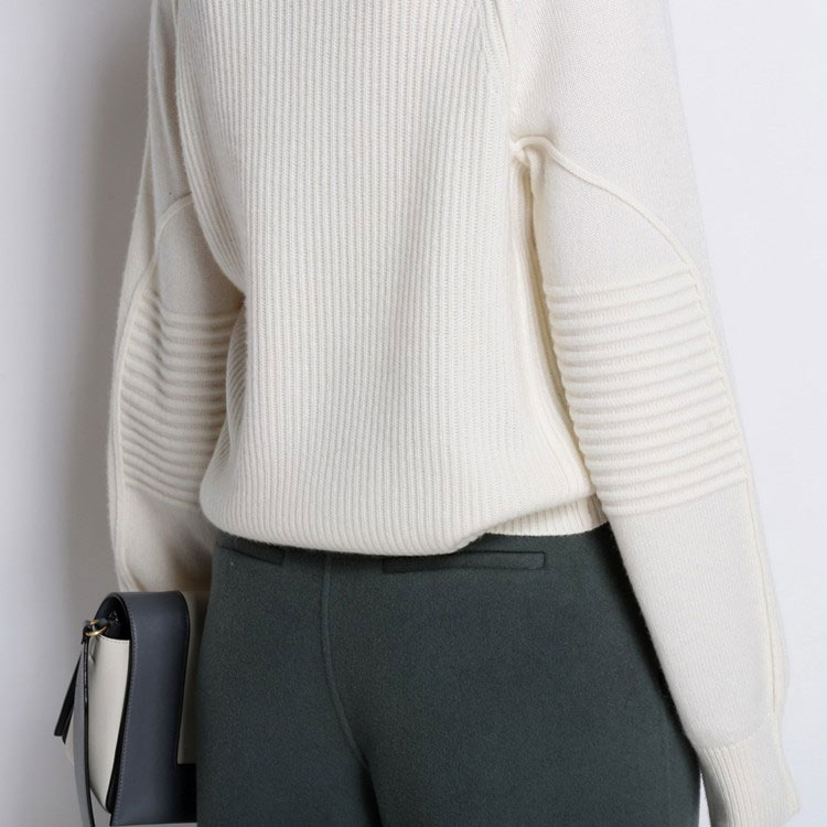100% Кашемировый фактурный джемпер с накладками на рукавах и воротом стойкой. Мягкий и воздушный кашемир, свободная форма легкого "оверсайзного" фасона