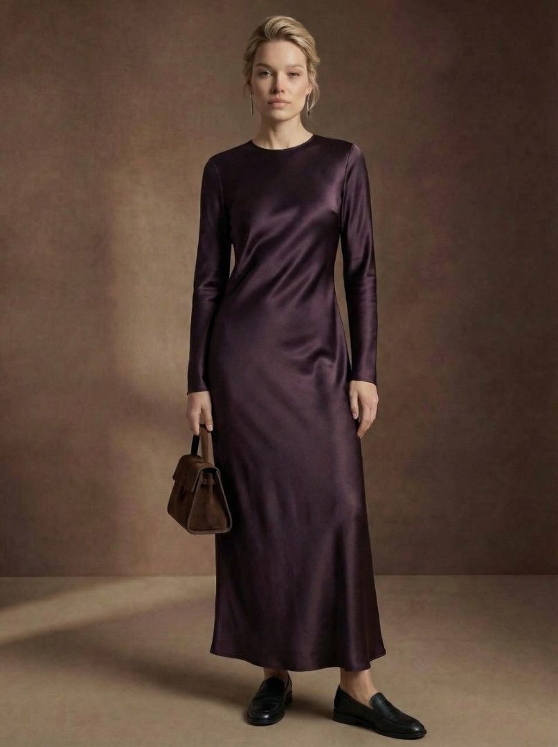 Роскошное платье из мягкого атласа в насыщенном и глубоком цвете. Модель вытягивает силуэт и делает фигуру визуально стройнее благодаря крою