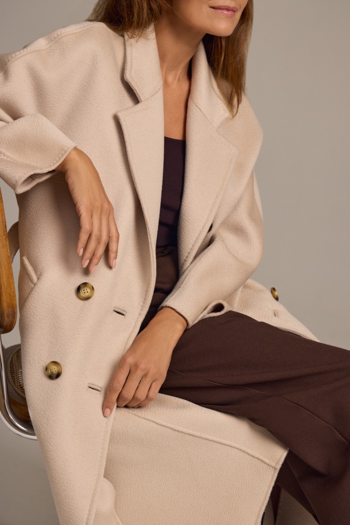 Классическая двубортная модель из роскошной шерсти с кашемиром в нежном жемчужном цвете