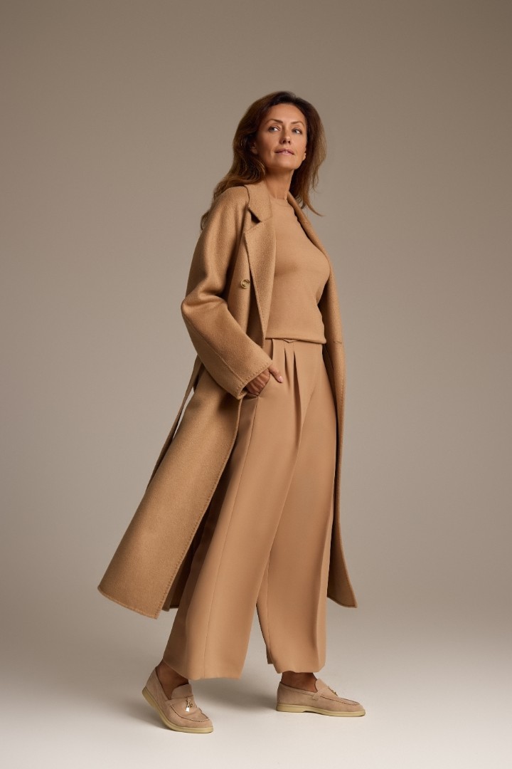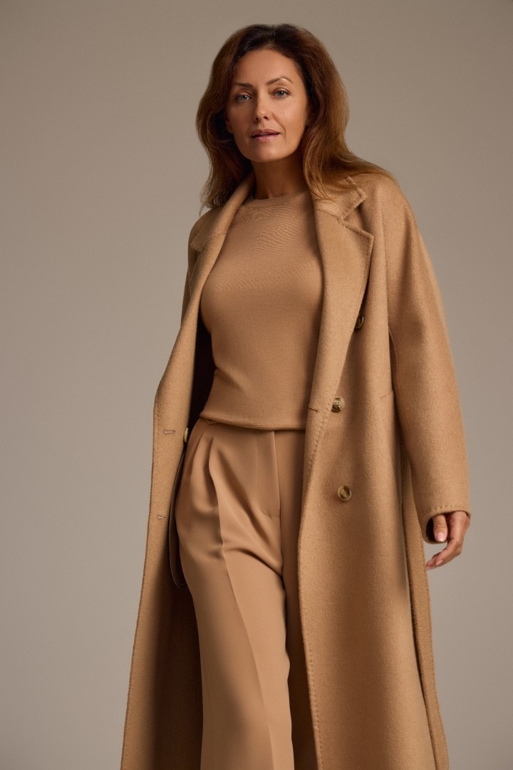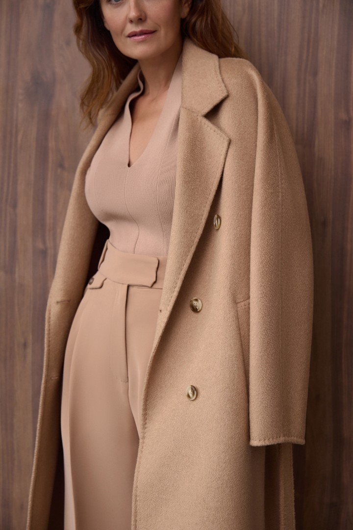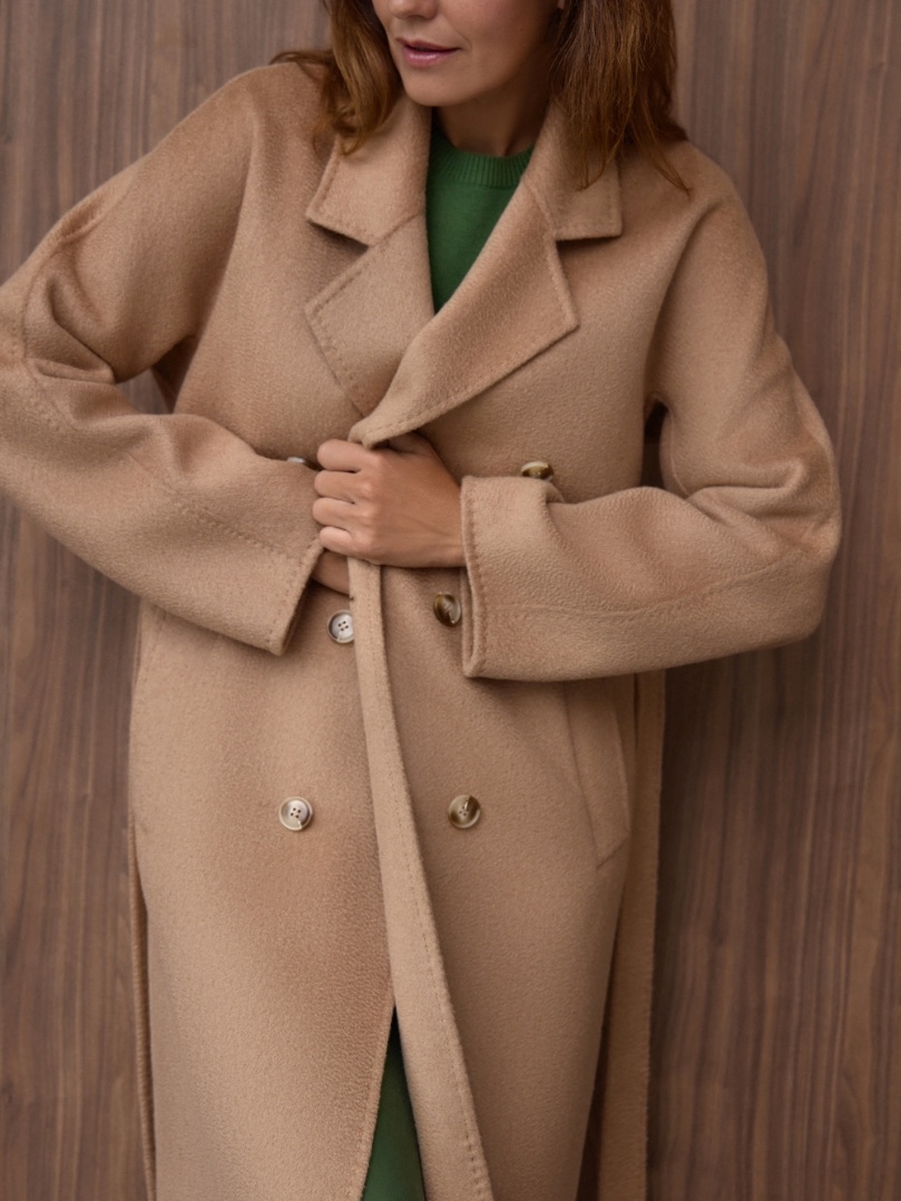 Классическая модель пальто в цвете Кэмел из мягкой шерсти с кашемиром, двусторонний пальтовый материал double face с ярко выраженной текстурой