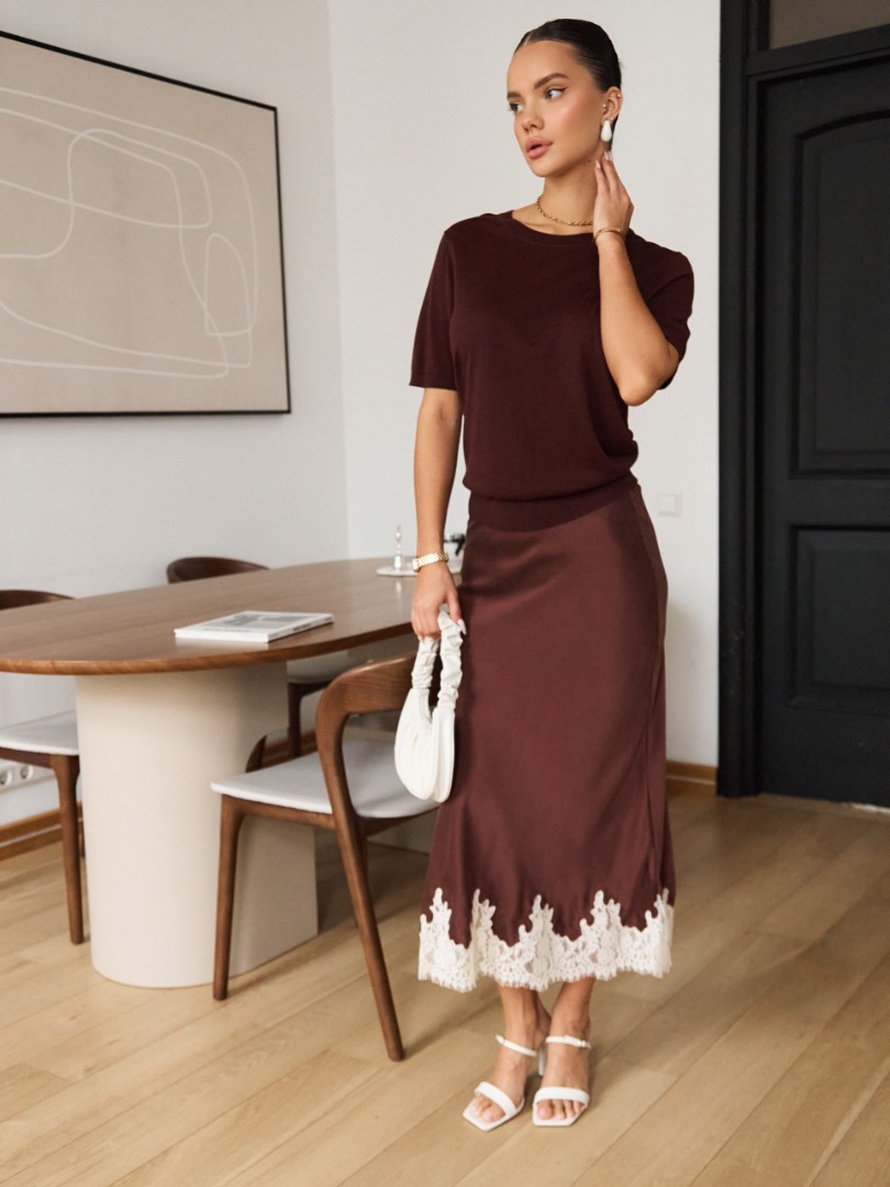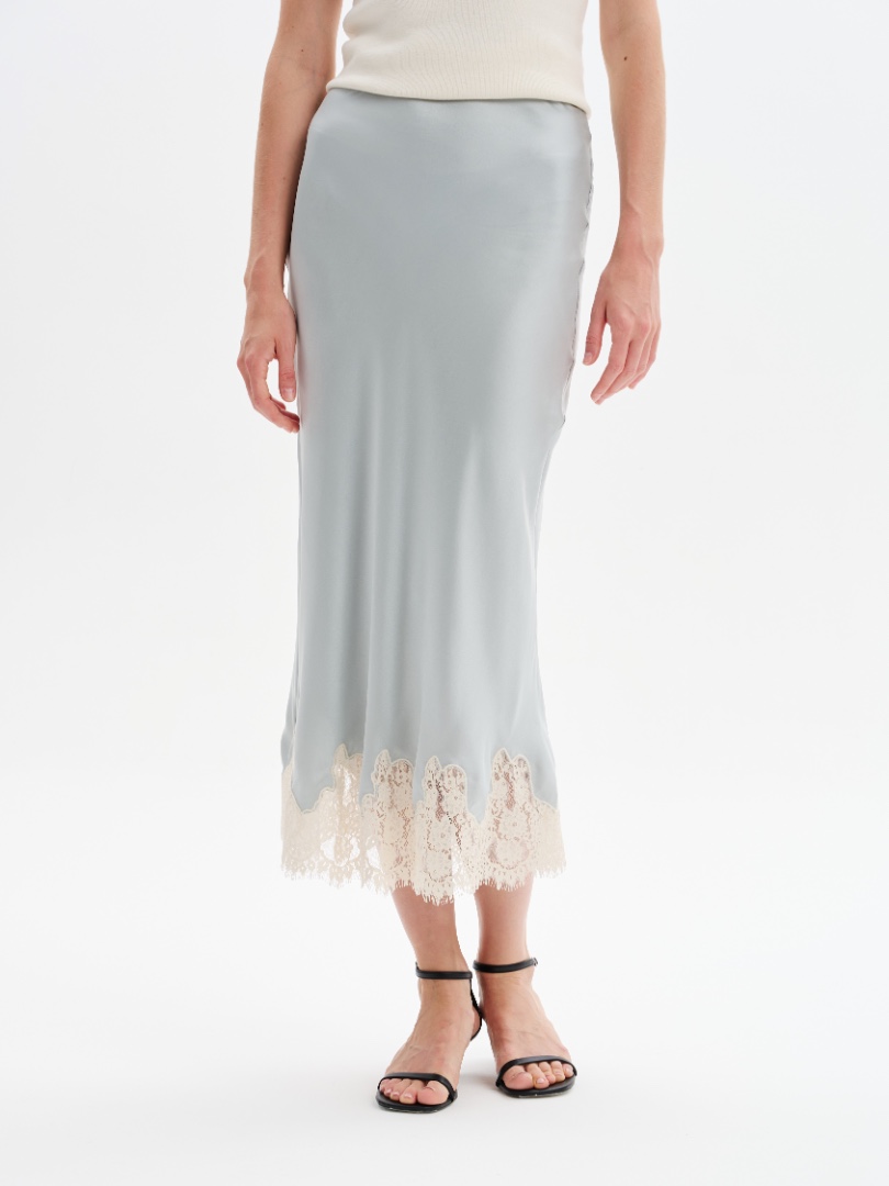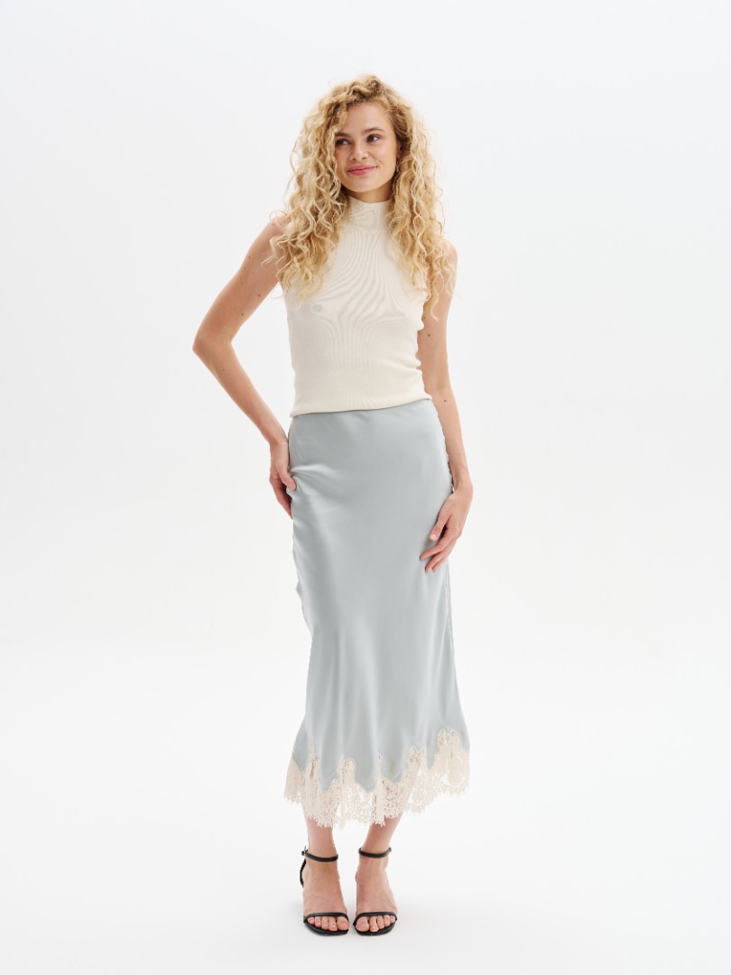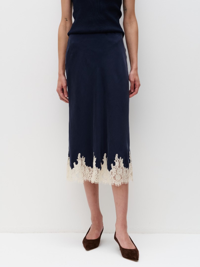 Юбка миди из натурально шелка с молочным кружевом шантильи в бельевом стиле делает образ нежным и женственным
