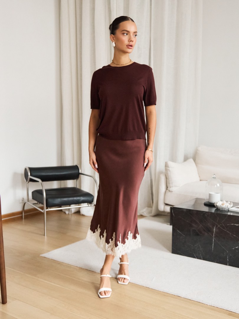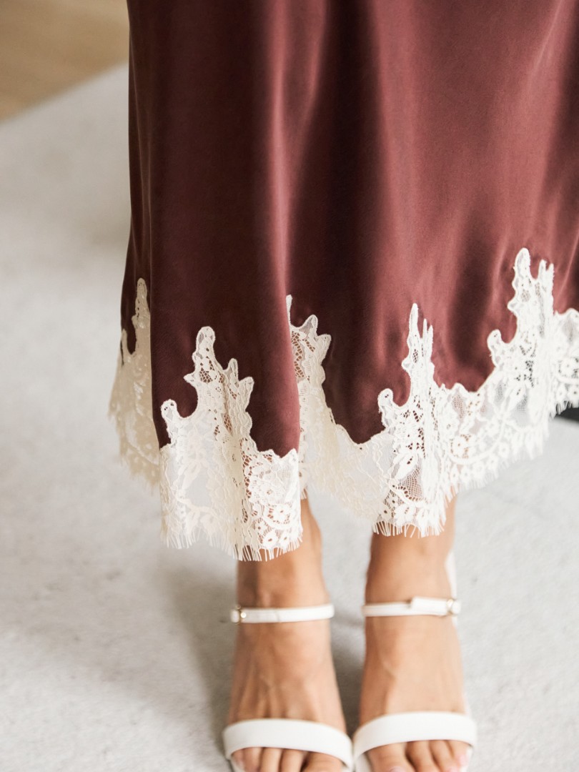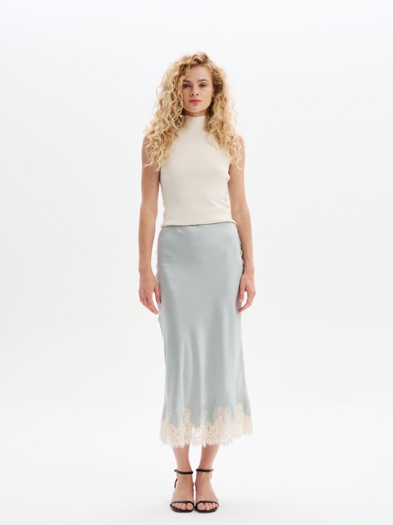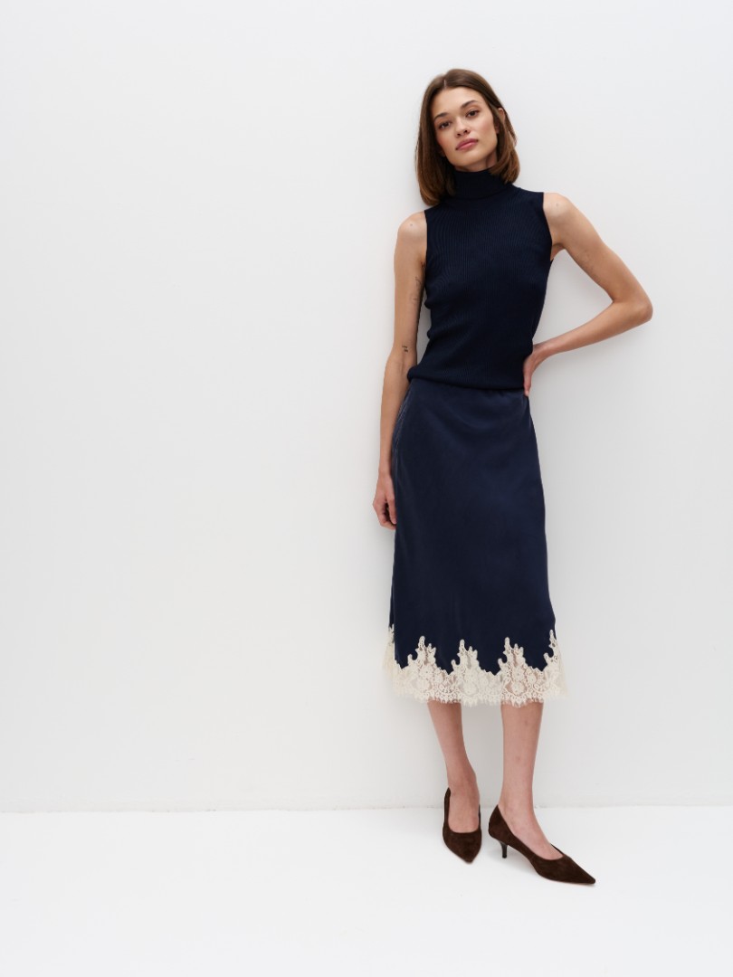 Юбка миди из натурально шелка с молочным кружевом шантильи в бельевом стиле делает образ нежным и женственным