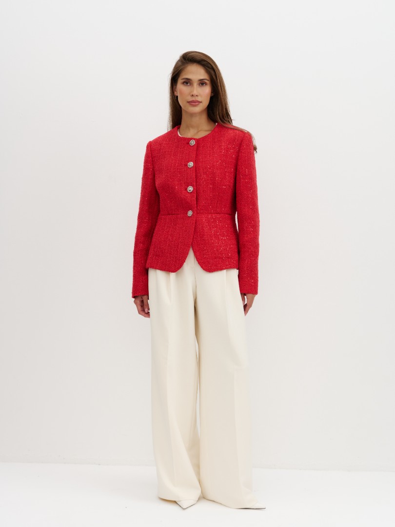 Приталенный жакет с карманами выполнен из тончайшего расшитого нитками твида с шелковой подкладкой