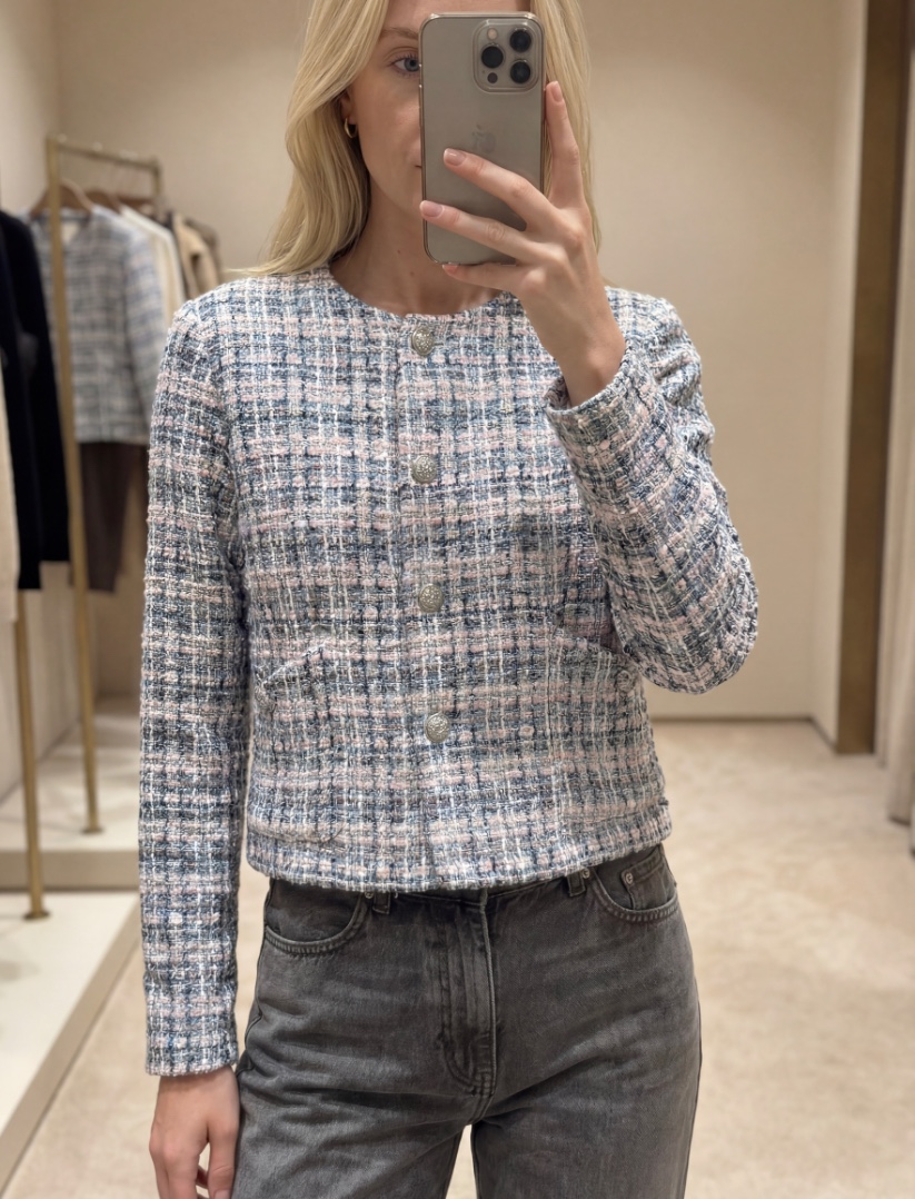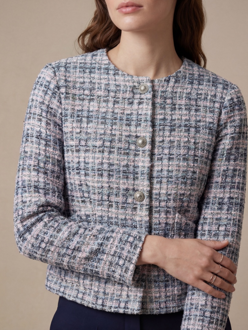 Жакет из тонкого изысканного твида крупного плетения, оттенки от нежно-розового до глубокого синего. Аккуратные карманы обработаны тоненькой декоративной цепочкой